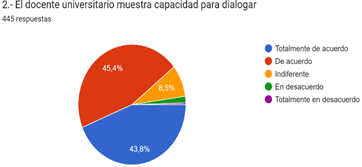 En el segundo planteamiento, que se refiere a si el docente muestra capacidad para dialogar, 195 encuestados manifiestan estar totalmente de acuerdo, 202 de acuerdo, 38 indiferentes, 8 en desacuerdo y 2 totalmente en desacuerdo.