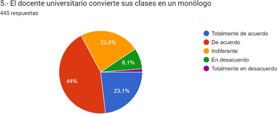 En la quinta gráfica, en donde se dice que el docente convierte sus clases en un monologo, se respondió por 103 estudiantes estar totalmente de acuerdo, 196 de acuerdo, 104 indiferentes, 36 en desacuerdo y 6 totalmente en desacuerdo.