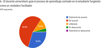 6.- El docente universitario guía el proceso de aprendizaje centrado en el estudiante fungiendo como un verdadero facilitador