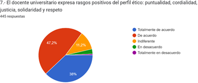 7.- El docente universitario expresa rasgos positivos del perfil ético: puntualidad, cordialidad justicia solidaridad respeto