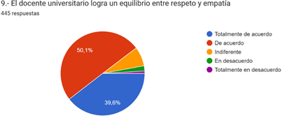 Respecto a que si los estudiantes consideran que el docente universitario logra un equilibrio entre respeto y empatía 176 totalmente de acuerdo, 223 de acuerdo, 33 indiferente, 9 en desacuerdo y 4 totalmente en desacuerdo.