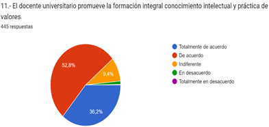 11.- El docente universitario promueve la formación integral conocimiento intelectual y práctica de valores |