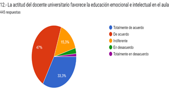 Por su parte en lo concerniente a la actitud del docente universitario favorece la educación emocional e intelectual en el aula 148 totalmente de acuerdo, 209 de acuerdo, 68 indiferentes, 13 en desacuerdo y 7 totalmente en desacuerdo.
