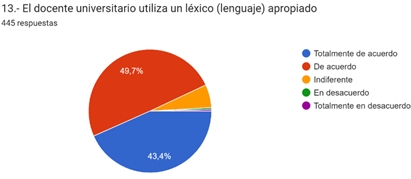 En el planteamiento en relación a si el docente universitario utiliza un léxico (lenguaje) apropiado 193 totalmente de acuerdo, 221 de acuerdo, 27 indiferentes, 2 en desacuerdo y 2 totalmente en desacuerdo.