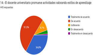 Acorde a la pluralidad de formas de asimilar el aprendizaje, se evaluó si el docente universitario promueve actividades valorando estilos de aprendizaje 154 totalmente de acuerdo, 229 de acuerdo, 43 indiferentes y 14 en desacuerdo y 5 totalmente en desacuerdo.