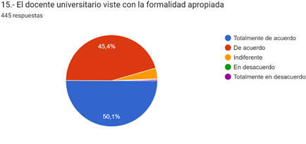 Por último, en lo que se cuestiona si docente universitario viste con la formalidad apropiada 223 totalmente de acuerdo, 202 de acuerdo, 17 indiferente, 1 de acuerdo y 2 totalmente en desacuerdo.