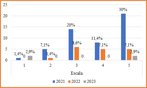 El mismo que se da respuesta gracias a la encuesta emitida a los profesionales graduados en los años 2021, 2022 y 2023, siendo los profesionales del año 2021 la mayor cantidad representados por el 69 % del total de la muestra; el 44,70 % se encuentra trabajando dentro del área de formación, es decir las áreas de trabajo propuestas en el Plan de Estudios (2013) de la Carrera de PEO. Lo indicado guarda estrecha relación con un estudio realizado por Martínez-Clares y González-Lorente (2021), en la que la tasa de desempleo es de 32,2 % entre los más jóvenes, convirtiéndose en uno de los países de la Organización para la Cooperación y el Desarrollo Económico (OCDE) con la tasa más elevada, tan solo superada por España y Grecia.