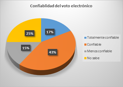 Respecto a la pregunta si consideran confiable el proceso de votación en forma electrónica, la mayoría responde que sí son confiables y menor proporción que no, (figura 2) con el argumento que toda máquina puede tener fallas en el sistema.