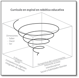 Aunque los primeros pasos en robótica educativa se dieron en Colombia a partir del año 2010, no fue sino hasta 2021 que Pérez y Mendoza presentaron una propuesta curricular de Robótica Educativa para el país. Esta propuesta se articula en torno a temáticas STEM, incluyendo: mecanismos, energía, electrónica, sensores, actuadores y programación. En lo que respecta a habilidades blandas, se enfatizan aspectos como el trabajo en equipo y la solución de problemas. Este nuevo planteamiento se caracteriza por la incorporación del enfoque de género como una habilidad social esencial. Su objetivo no es fomentar rivalidades entre géneros, sino más bien promover la integración, capitalizando los talentos y habilidades individuales de cada persona. A continuación, se presentará el cuadro con los ejes del modelo curricular en robótica educativa propuesto por Pérez y Mendoza (2020, p. 580) para Colombia.