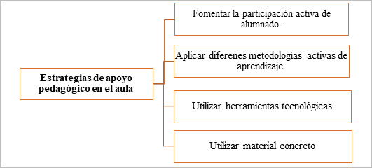 Como se observa en la figura número 2 para lograr un buen apoyo pedagógico en el aula es necesario que el maestro fomente la participación del alumnado, de esta manera todos los estudiantes tienen la oportunidad de lograr los aprendizajes propuestos de manera colaborativa (López Vera et al., 2020). Otra estrategia efectiva para el apoyo pedagógico es aplicar diferentes metodologías activas como el trabajo cooperativo, el aprendizaje basado en problemas, el aprendizaje basado en proyectos, gamificación, aula invertida, entre otros