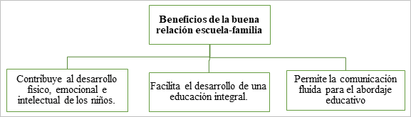 La relación ente los padres de familia y los docentes es primordial para el buen desempeño académico de los estudiantes. Para poder generar buenas relaciones interpersonales entre los miembros del quehacer educativo, es necesaria que exista una comunicación activa. Esto permite que tanto los maestros como los padres estén al tanto de la vida estudiantil de los niños, así como de sus aciertos y desaciertos, de esta manera podrán trabajar en conjunto por el bienestar y la formación integral de los educandos. En la figura número 3 se expresan algunos beneficios para fomentar la buena relación entre la familia y la escuela.