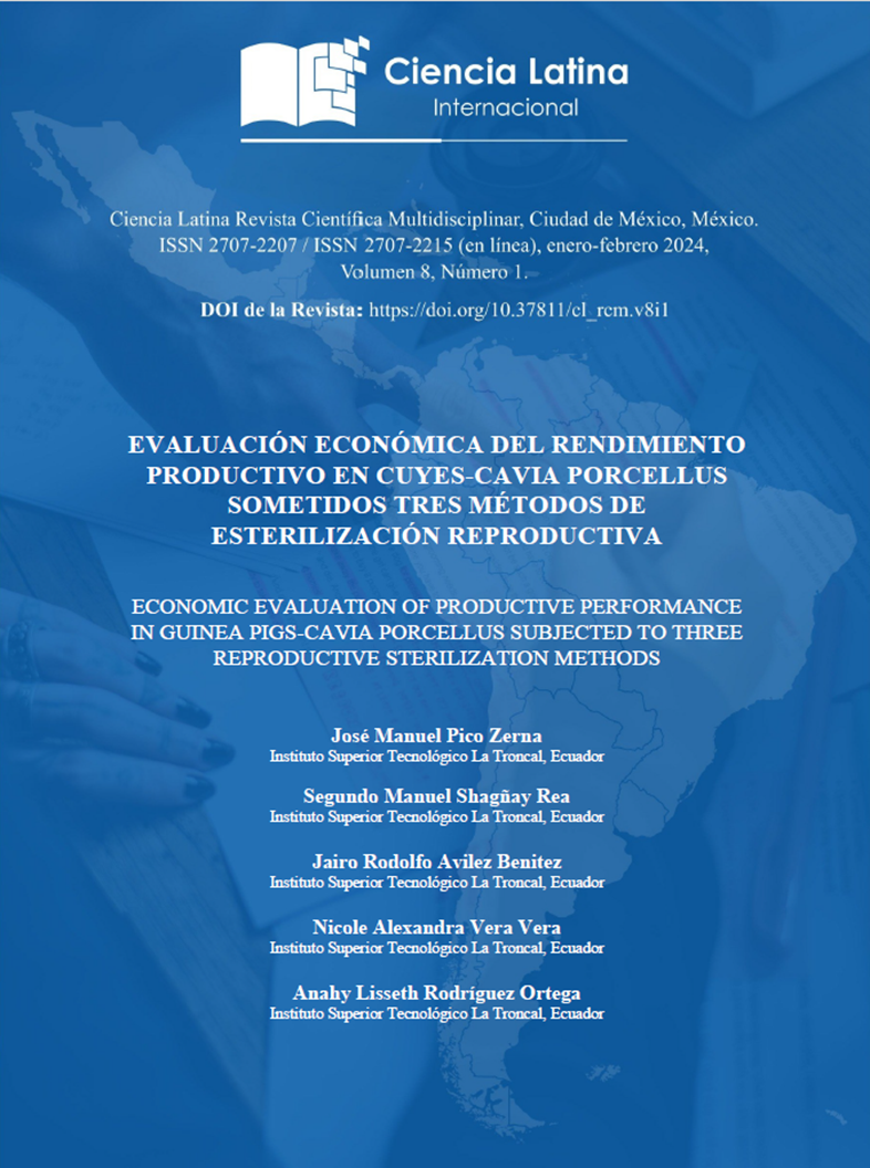 Shagñay Rea, S. M., Pico Zerna, J. M., Endara Cercado, W. F., Encalada Torres, H. A., & Criollo Largo, T. K. (2023). Evaluación de tres métodos de esterilización reproductiva y su influencia sobre la conversión alimenticia en cuyes (Cavia porcellus). Ciencia Latina Revista Científica Multidisciplinar, 7(3), 2269-2289. https://doi.org/10.37811/cl_rcm.v7i3.6348