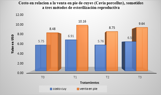 Estos resultados subrayan la influencia positiva de la esterilización en los parámetros productivos y económicos. En concordancia con un estudio de Zevallos (2019), donde se establece que el precio de los animales se determina por el peso, los costos del cuy faenado entero y empacado de 1.300 a 1.500 g oscilan alrededor de 15 dólares. Tipán y Cando (2017) respaldan la importancia de precios competitivos basados en la calidad, proponiendo valores de 9 a 10.50 dólares para cuyes en pie y 12.50 para cuyes faenados. Estos rangos coinciden notoriamente con los resultados obtenidos en la presente investigación.