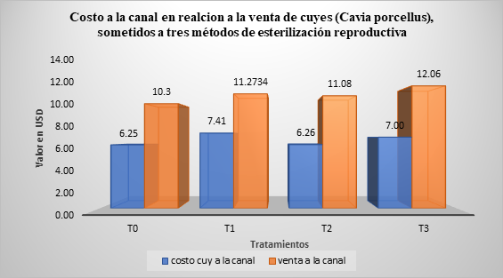 Gráfico 2. Costo a la canal en relación a la venta de cuyes (Cavia porcellus), sometidos a tres métodos de esterilización reproductiva