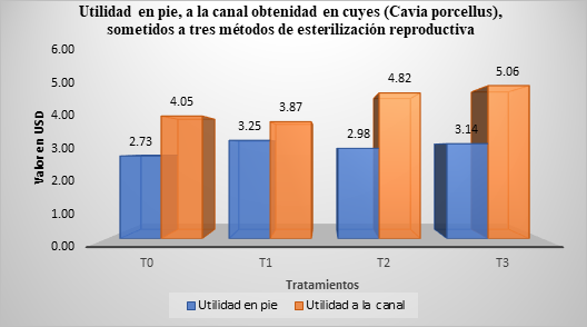 Gráfico 3. Utilidad en pie, a la canal obtenida en cuyes (Cavia porcellus), sometidos a tres métodos de esterilización reproductiva