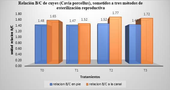 Gráfico 4. Relación B/C en pie, a la canal obtenida en cuyes (Cavia porcellus), sometidos a tres métodos de esterilización reproductiva