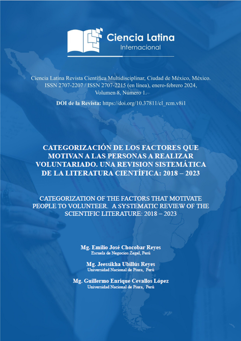 The objective of the research was to categorize the main factors that motivate people to volunteer, with a systematic review methodology of scientific literature in the period 2018 to 2023 for the EBSCOhost, ProQuest and Scielo databases. The search string was the keywords “voluntariado OR volunteering” AND “motivación OR motivation”, the inclusion criteria of only considering scientific articles in English, Spanish and Portuguese, in full text, in refereed publications with DOI and as criteria of exclusion of documents that were not scientific articles, outside the established range of years, articles repeated in different databases, in different languages and without DOI, obtaining a total of 35 scientific articles. The results allowed the factors to be grouped into categories such as intrinsic motivations, experiences, attitudes, family, educational activities, communication, work environment, emotional intelligence, resilience, trust, macro and micro-organizational structures, profile, age, laws, image, selfishness, service-learning (APS), skills, among others. The research concluded that the factors that motivate people to volunteer are very diverse; However, they are closely related to factors specific to the person and external factors closely related to the environment where the project takes place.