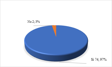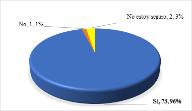 En la figura 2, se presenta un resultado altamente positivo en cuanto a la plataforma Electude para potenciar la confianza al enfrentar prácticas educativas en la carrera de Ingeniería Automotriz. Un 97% equivalente 74 participantes mencionan que Electude desempeña un papel crucial para fortalecer la confianza de los alumnos en cuanto a las habilidades prácticas y la seguridad de los alumnos en su desempeño. Mientas que, un bajo porcentaje (3%), no afirma tener confianza en la plataforma. En un estudio desarrollado por Mujica y Sequera (2023), comentan que el modelo de enseñanza actual, denominado “tecno pedagógico”, ha experimentado un fortalecimiento notable como recurso de respaldo en el proceso de enseñanza aprendizaje. Al mismo tiempo, diferentes instituciones a nivel internacional promueven el uso de las tecnologías educativas.