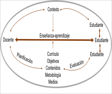 Esta figura refleja los protagonistas del proceso de enseñanza-aprendizaje: docentes y estudiantes con una relación bidireccional que impacta todo el proceso. De igual manera, se visualiza en la figura un docente que planifica y ejecuta el acto pedagógico, tomando en cuenta el contexto, las características de sus estudiantes, el currículo, objetivos, contenidos, metodología, medios de enseñanza y la evaluación. En cuanto a los estudiantes, mantienen una interacción constante entre sí, que repercute en el trabajo en equipo, la disciplina y en el aprendizaje colaborativo. Por último, el contexto influye y es influido por los docentes y estudiantes, afectando de manera directa el proceso de enseñanza – aprendizaje.