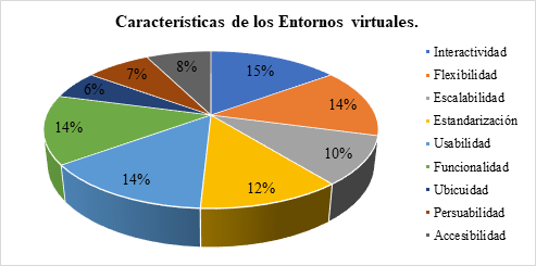 Como se muestra en la tabla 5; de acuerdo con los datos presentados sobre las características de los entornos virtuales en este contexto esta pregunta tuvo respuestas muy variadas y se puede dar el siguiente análisis: el 15% de los estudiantes indicaron como características de los entornos virtuales la interactividad, el 14% de los estudiantes indicaron como características de los entornos virtuales la flexibilidad, el 10% de los estudiantes indicaron como características de los entornos virtuales la escalabilidad, el 12% de los estudiantes indicaron como características de los entornos virtuales la estandarización, el 14% de los estudiantes indicaron como características de los entornos virtuales la usabilidad, el 14% de los estudiantes indicaron como características de los entornos virtuales la funcionalidad, mientras que el 6% de los estudiantes indicaron como características de los entornos virtuales la ubicuidad, el 7% de los estudiantes indicaron como características de los entornos virtuales la persuabilidad, y el 8% de los estudiantes indicaron como características de los entornos virtuales la accesibilidad.