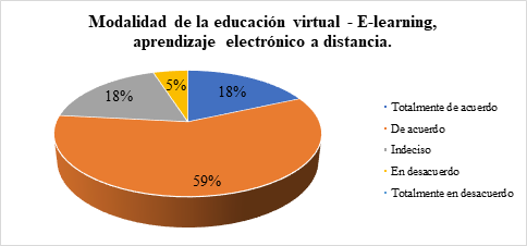 Como se muestra en la tabla 6; de acuerdo con los datos presentados sobre la modalidad de la educación virtual - E-learning, aprendizaje electrónico a distancia, que utiliza la red para la distribución de información, que se basa en el uso de las TIC y requiere que es estudiante este motivado y que tenga habilidades para el aprendizaje autónomo. En esta pregunta los criterios expuestos se mencionan a continuación y se puede dar el siguiente análisis: el 22% de los estudiantes indicaron estar totalmente de acuerdo, mientras que el 58% de los estudiantes indicaron estar de acuerdo, el 16% de los estudiantes indicaron estar indeciso, y un 4% de estudiantes indicaron estar en desacuerdo.