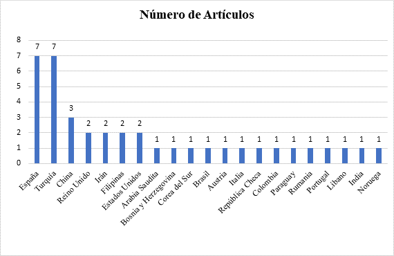 Se pudo observar que, en el total de artículos recopilados de 21 países, España y Turquía lideran con 7 artículos, seguido por China con 3. Otros países tienen entre 1 y 2 artículos, mostrando una distribución global de la investigación sobre nomofobia y temas relacionados. En la mayoría de los estudios realizados se observa que el instrumento por excelencia aplicado en la mayoría de los estudios fue el cuestionario de Nomofobia (NMP-Q).