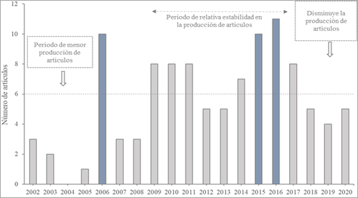 En el periodo 2002-2005 se registró la menor cantidad de publicaciones, entre 2009 y 2017 puede valorarse como un periodo de relativa estabilidad en la producción científica sobre la temática, aunque a partir de este último año se registraron cantidades inferiores a la media de publicación por años.