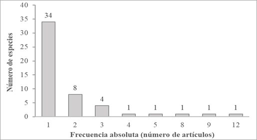 Figura 4. Número de especies y frecuencia de artículos donde se investigaron