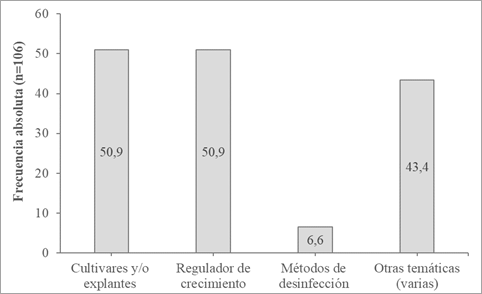 Entre las temáticas más abordadas en los artículos se encontraron los cultivares y/o explantes y los reguladores de crecimiento, ambos en el 50,9 % de los artículos analizados. En el 6,6 % de estos se estudiaron diferentes métodos de desinfección; mientras que, en el 43,4 % fueron analizadas otras temáticas (Figura 5).