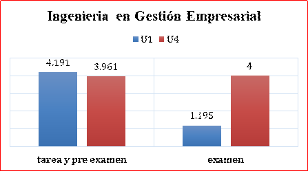 Los resultados de cada uno de los rubros definidos (en base diez), exponen para la primera carrera (IGE) en la unidad 1, un promedio de 8.71 en tarea, 7.07 en pre examen y un 2.59 en examen, para la unidad 4, un promedio de 7.69 en tareas, 8.85 en pre examen y un 8 en examen, tal como lo muestra la Tabla1.