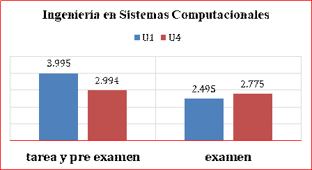 La figura 2, de la carrera de Ingeniería en Sistemas Computacionales, muestra que las tareas y pre examen realizado en plataforma Moodle, es 1.6 veces mayor al promedio del examen en la unidad 1, de igual forma en esta Ingeniería, se observa que los estudiantes se adaptaron a entregar todo tipo de trabajos bajo esta modalidad en línea. Con respecto a la unidad 4, que fue realizada en línea, se puede observar que el promedio de tareas más pre examen es muy cercano al promedio del examen, lo cual nos indica que el trabajar en la modalidad en línea, el resultado es muy similar, solo con 219 milésimas de diferencia de la tarea y pre examen, con respecto al promedio del examen elaborado en línea.