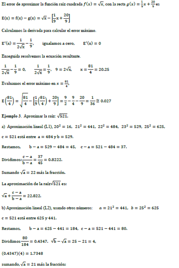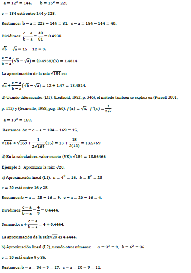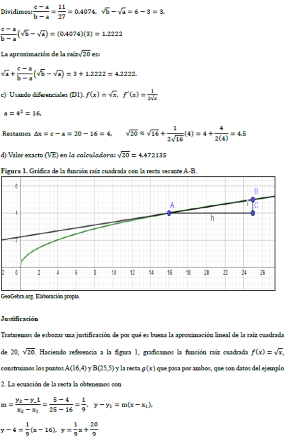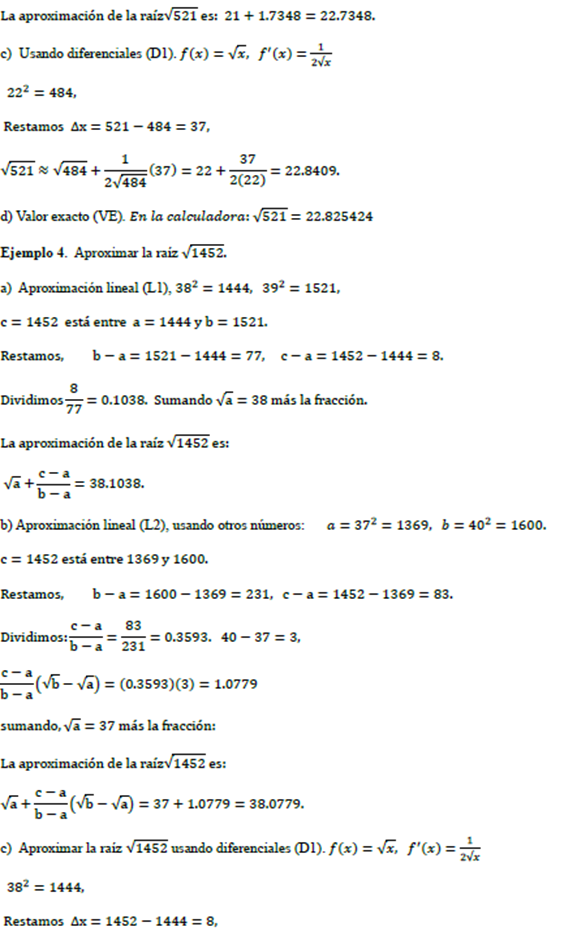 De la tabla 1 podemos observar que la aproximación lineal es una “buena” aproximación, desde el momento que seleccionamos dos números enteros cercanos al número del cual deseamos aproximar la raíz cuadrada. Otra cosa que podemos observar es que la aproximación mediante diferenciales solo es buena cuando el incremento de x es pequeño, es decir, cuando el número del cual queremos aproximar la raíz cuadrada está cercano a uno que tiene raíz cuadrada exacta, mientras que para la aproximación lineal no es necesaria esta condición.