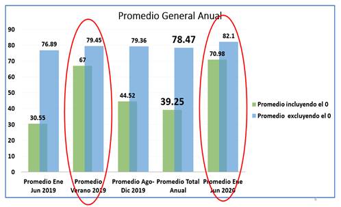 La presente investigación fue llevada a cabo inicialmente de la obtención de los datos obtenidos en la figura 1, la cual representa los promedios en aprovechamiento escolar, de 3 periodos distintos del año 2019, el primer periodo comprende el semestre enero junio, el segundo periodo fue el curso de verano y el tercer periodo el semestre agosto diciembre, donde es posible observar que el periodo con mejor aprovechamiento escolar (promedio general en calificaciones de toda la matricula por periodo) fue el obtenido en curso de verano, en particular nos referimos al promedio excluyendo el cero. Fue tomado en cuenta, para la misma grafica un cuarto periodo que corresponde al semestre ene-jun 2020, el cual fue el periodo cuando fue declarada la emergencia sanitaria, en la cual podemos observar, que el promedio es superior a cualquier periodo del año anterior 2019, inclusive es superior al promedio obtenido en un curso de verano (un curso de verano supone una calificación superior a las obtenidas en periodos semestrales escolares, ya que el estudiante se supone que está dedicado a trabajar en solo una materia).