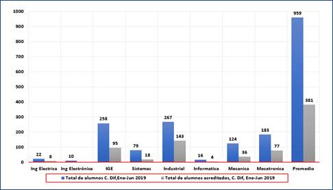Figura 2. Alumnos inscritos y acreditados en cálculo diferencial, por carrera, semestre ene-jun 2019