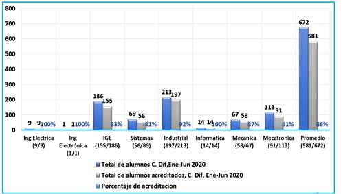 Según los datos obtenidos en la figura 5, de estudiantes inscritos por periodo, se observa una reducción del 46 % del alumnado del semestre ene-jun 2019 al semestre ene-jun 2021, sin embargo, el porcentaje de acreditación disminuyó del 86 % al 81 %, del semestre ene-jun 2020 al semestre ene-jun 2021.