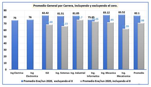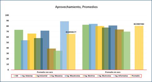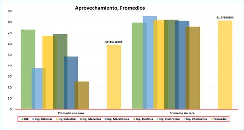 Se puede observar de la figura 4, la barra de mayor magnitud nos indica el promedio de aprovechamiento escolar por carrera excluyendo el 0, es decir el promedio total de los estudiantes que acreditaron la materia, seguido por las barras de menor, incluyendo el 0, las cuales indican el promedio general de todos los estudiantes que cursaron la materia, refiriendo a los que la acreditaron más los que no la acreditaron.