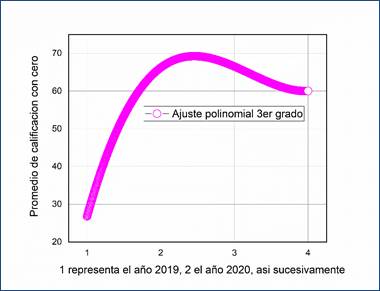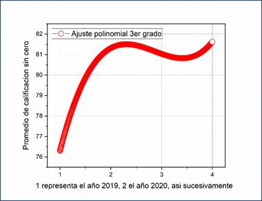Es posible observar en la figura 9, los 4 puntos brutos originales, como promedio de cada ciclo, entre los años 2019-2022, particularmente en el ciclo escolar ene-jun, respectivamente, con un ajuste suave que representa el comportamiento cúbico.