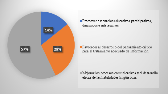 En lo que respecta a los beneficios que se lograron generar en el aula con la aplicación de la técnica del debate, el 57% de la población evaluada que corresponde a 12 estudiantes consideran, que la misma, logra mejorar los procesos comunicativos y el desarrollo eficaz de las habilidades lingüísticas, el 29% que se refiere a 6 alumnos, mencionan que favorece el desarrollo del pensamiento crítico para el tratamiento adecuado de información, finalmente, en un 14% que responde a 3 discentes de la población, aluden a que se promueve escenarios educativos participativos, dinámicos e interesantes.