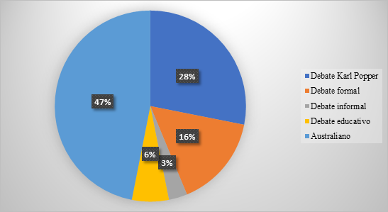 De acuerdo con los resultados adquiridos, en lo que se refiere al tipo de debate más apropiado para trabajar contenidos, el 47% de la población, opta por la aplicación del debate australiano, en un 28% consideran propicio utilizar el debate de Karl Popper, el 16% aluden a la práctica educativa con el debate formal, mientas que, el 6% estima más interesante el debate educativo, finalmente, en un 3% proponen el desarrollo de las clases con el uso del debate informal.