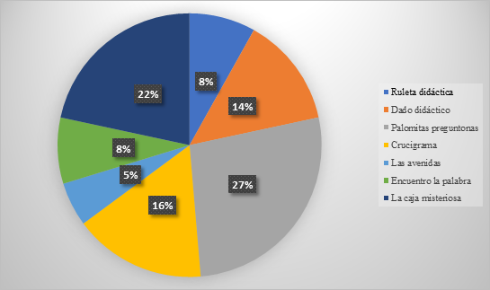 La representación gráfica denota que en un 27% de la población evaluada considera pertinente utilizar el recurso de las palomitas preguntonas, en un 22% estiman el uso de la caja misteriosa, el 16% apoya la práctica del crucigrama, por otro lado, el 14% considera que el dado didáctico aporta significativamente en su proceso, mientras que, el 8% atribuye un valor pedagógico en el recurso de las avenidas, de igual forma, en un 8% requieren trabajar con el recurso encuentro la palabra, finalmente, en un 5% priorizan en el material de las avenidas, puesto que genera mejores relaciones en el proceso comunicativo.