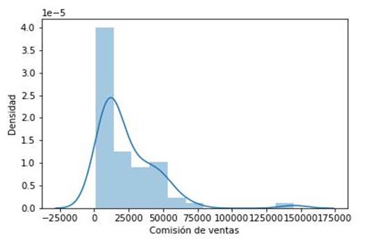 Densidad de las comisiones obtenidas. Se identifica que el rango del monto que se tienen más comisiones pro las ventas esta entre 0 y $50,000.