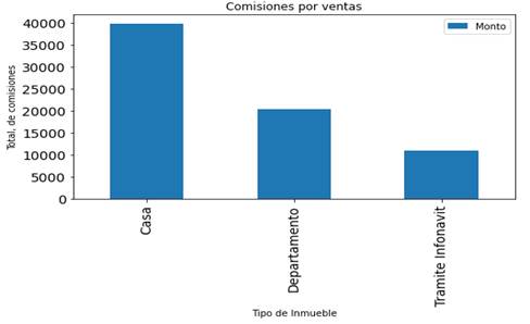 Comisiones obtenidas. Se identifica la venta de casas genera el mayor monto de comisiones, le sigue la venta de departamentos y tramites de créditos Infonavit.