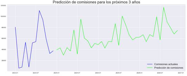 Se ejecuta la predicción del modelo ARIMA y se obtiene las predicciones de comisiones para los próximos tres años 2024, 2025 y 2026, se observa que de continuar las estrategias actuales se tendrá un alta de las ventas, esto considerando que al ya no estar en pandemia las ventas aumentaron considerablemente durante 2022 y 2023.