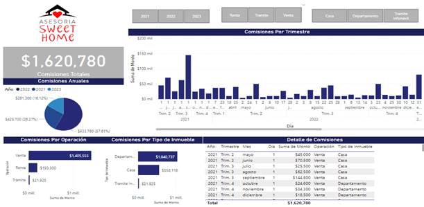 La operación que más comisiones genera es la venta de inmuebles, el tipo de inmueble más vendido es departamento.