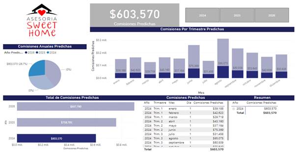 Predicción de comisiones 2024, 2025 y 2026 . Se observa que los meses de junio y septiembre son los picos más altos en los que se encontrará el mayor número de ventas.