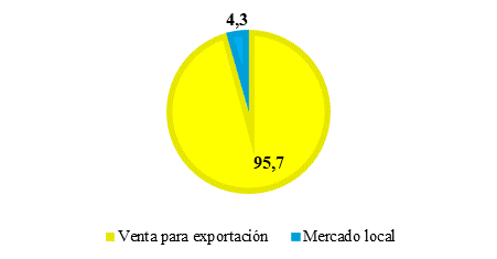 En el Gráfico 2 se presenta un análisis pormenorizado de los mercados a los cuales acceden los emprendimientos en el agronegocio del aguaymanto en la provincia de Hualgayoc, categorizados en Venta local y Venta para exportación. Se destaca que la Venta para exportación prevalece de forma abrumadora, representando un 95.7% del total de los mercados, mientras que la Venta local se limita al 4.3%. Estos resultados, basados en el análisis de 94 emprendimientos, coinciden con investigaciones previas, como la de Gonzales Cárdenas (2020), que reporta un 89% de ventas destinadas a la exportación, y la de Cotera (2021), que menciona un 63.8% de ventas en ese mismo sentido, confirmando la marcada inclinación hacia la comercialización en mercados de exportación en la industria del aguaymanto en la región de Hualgayoc.