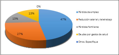 Al consultar sobre la afectación que trajo la pandemia del COVID-19, en lo personal a cada uno de los emprendedores, se pudo conocer que el 47% de estos perdieron sus empleos, el 27% experimentaron reducción salarial producto de la ley de Ley Orgánica de Apoyo Humanitario para Combatir la Crisis Sanitaria Derivada del COVID-19, 13% perdieron familiares por contagio y 13% se encuentran saldando deudas por concepto de medicinas y servicios de salud.