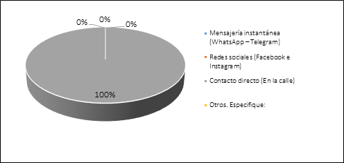 Sobre el medio a través del cual promocionan sus productos, se pudo constatar que estos no hacen uso de las redes sociales o mensajería instantánea, ya que mayormente, realizan la venta por contacto directo.
