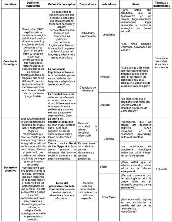 At present, a problem is being experienced in the teaching-learning processes of the second grade of the Gómez Abad School, where teachers show a weak command of phonological awareness in students, which conditions them in their academic development, with respect to new remnants such as, in the first instance, the domain of reading and other metalinguistic competence, which has a negative impact on cognitive development. The general objective is "Describe the relationship between cognitive development and phonological awareness in children in the second year of basic education at the "Manuel Gómez Abad" School for the period 2023-2024". The methodology includes a qualitative - quantitative modality, which made it necessary to simultaneously apply methodologies (Interpretative - Positivist), techniques and instruments (Survey made up of 10 reagents and socialized via electronic - Interview, conducted in person), while by On the other hand, it is a descriptive - ethnographic study. The sample consisted of the director of the institution and 10 teachers. For the validation test of the instruments, the expert judgment of three education professionals was used and in the hypothesis test the parametric statistic of Karl Pearson was considered.