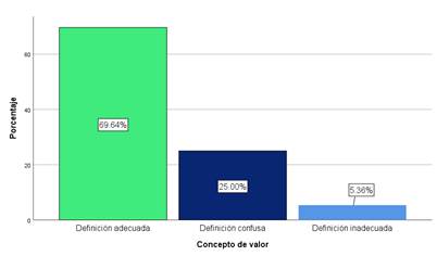 Se realizó la pregunta abierta ¿Qué es un valor? A lo que, considerando las definiciones de Mendoza, A. et. al. (2009) y Molina, M. (2004) se clasificaron en tres categorías las respuestas a lo que en la figura 6 se muestra que el 69.64% logró dar una definición adecuada, el 25% una definición confusa y el 5.36% no lograron una definición del concepto de valor.